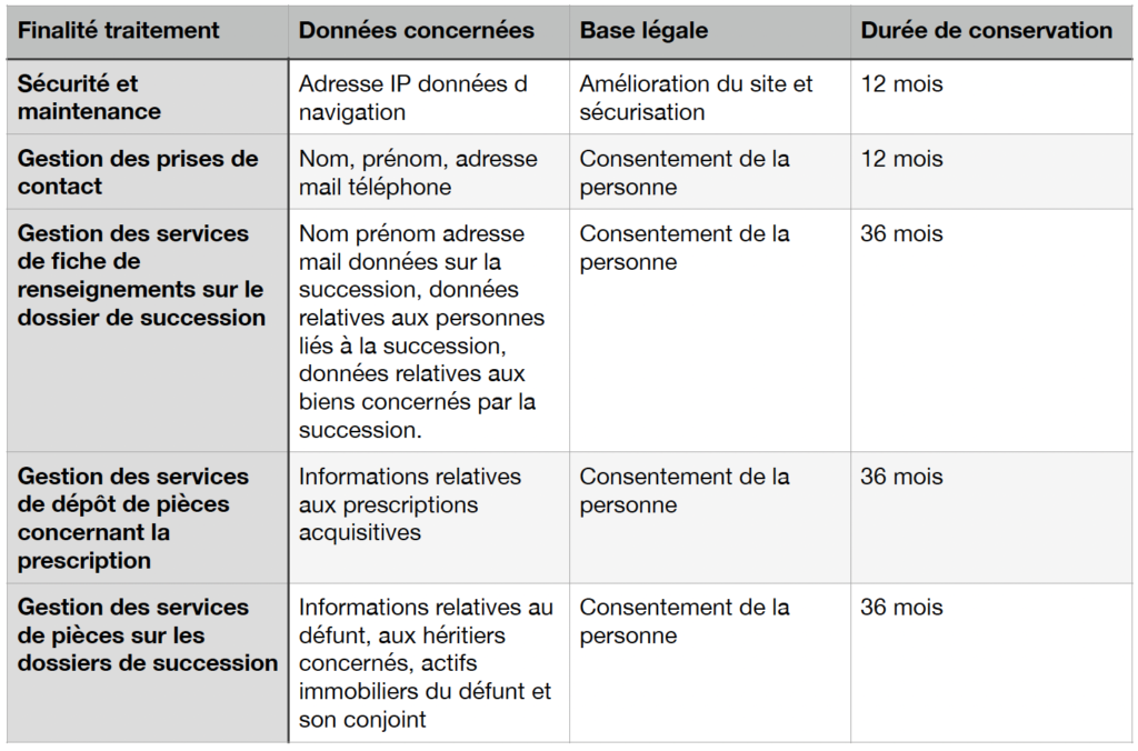 - Des informations relatives à la prescription trentenaire et au titrement. ( Des informations financières ou Des informations techniques (notamment comportement de navigation sur le Site, adresse IP, consentement)).